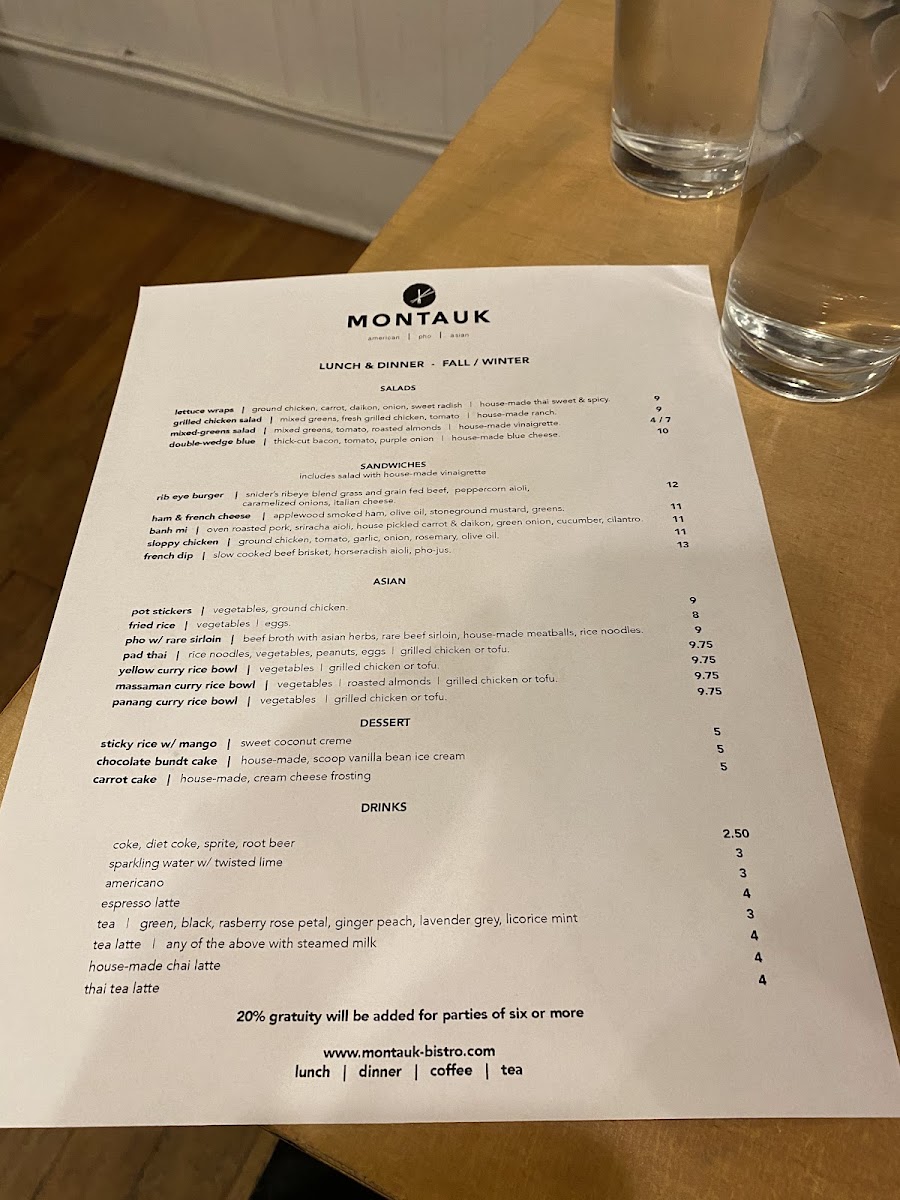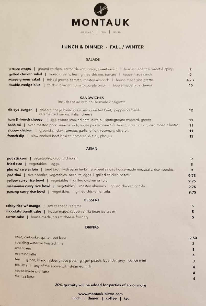 The menu features a diverse selection of dishes reflecting New American and Asian fusion influences, suitable for breakfast, brunch, lunch, and casual dining occasions. It includes a variety of sandwiches, Asian-inspired dishes, and desserts alongside coffee and specialty beverages.
